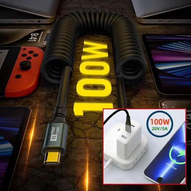 Stretch Coiled USB-C USB4 Cable 20Gbps 100W 8K Type-C Right Angled Male to Male Cable Power Data for Laptop Keyboard Tablet