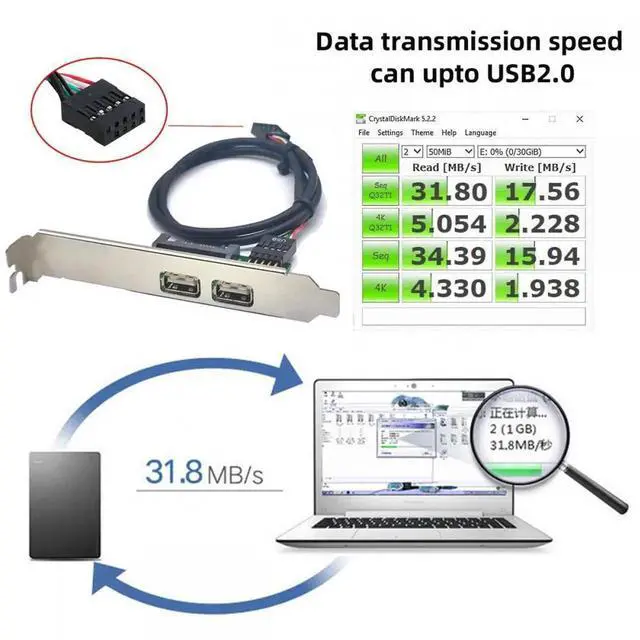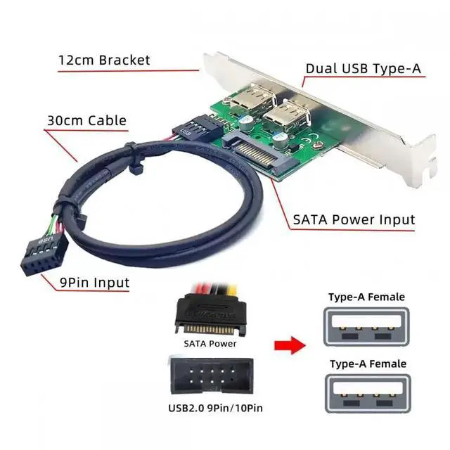 Cable length 30cm, With 12cm length standard PCI-E bracket,Very easy to use USB2.0 data cable connected to the chassis back panel of USB2.0.