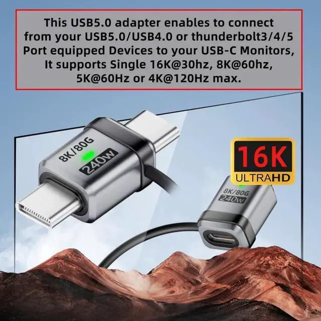 This USB5.0 adapter enables to connect from your USB5.0/USB4.0 or thunderbolt3/4/5 Port equipped Devices to your USB-C Monitors, It supports Single 16K@30hz, 8K@60hz, 5K@60Hz or 4K@120Hz max. video Resolution in your external displays.(please make sure your monitor's Type-c port support DP Alternate Mode for Video.)