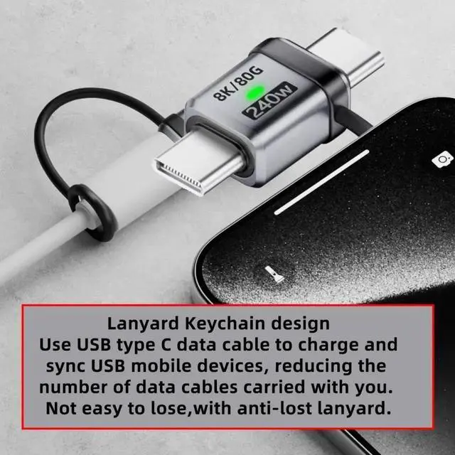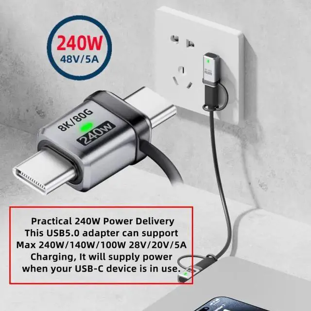 ThisUSB5.0 adapter can support Max240W/140W/100W 28V/20V/5A Charging, It will supply power when your USB-C device is in use. Reversible Design for Type C connector,Reversible plug orientation Cable direction.