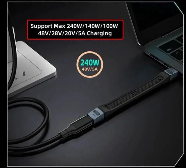 7. ThisUSB5.0 Cable can support Max240W/140W/100W 28V/20V/5A Charging, It will supply power when your USB-C device is in use. Reversible Design for Type C connector,Reversible plug orientation Cable direction.