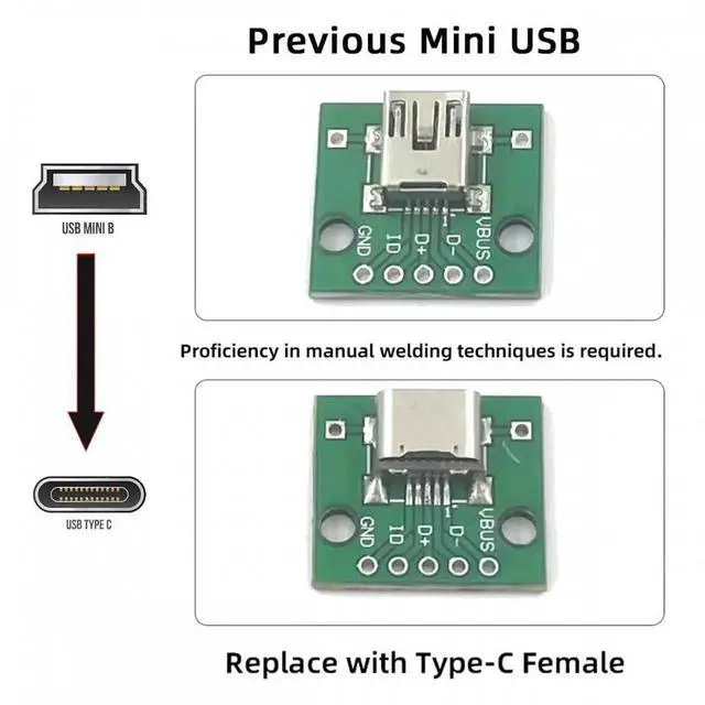 The Type-C female connector is replaced for Mini USB 5Pin Female; For DIY OEM solder use.