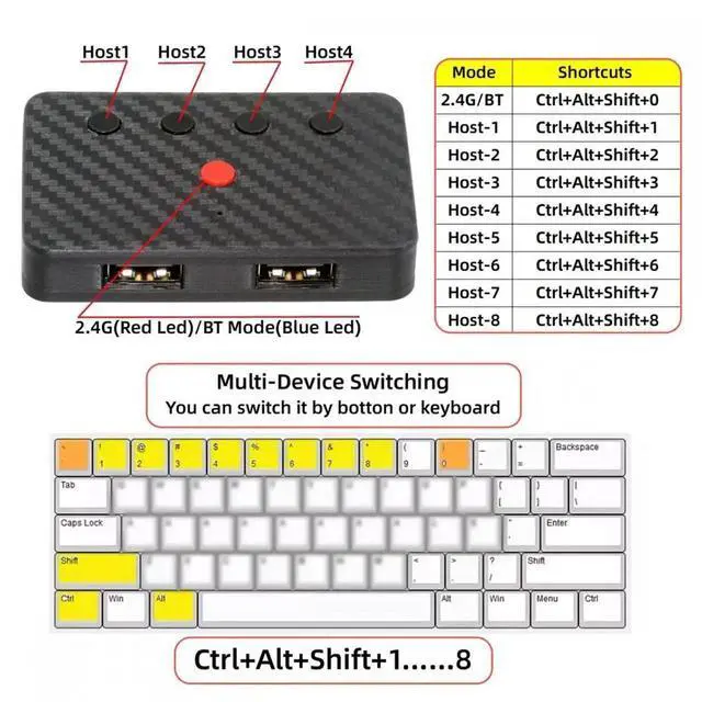 You can convert wired keyboard and mouse to BT or wireless 2.4G. BT mode supports switching 8 devices, You only need to connect our adapter byBT. Wireless 2.4G mode also supports switching 8 devices. You need to purchase the extral 2.4G receiver separately.(only one receiver in the package.)
