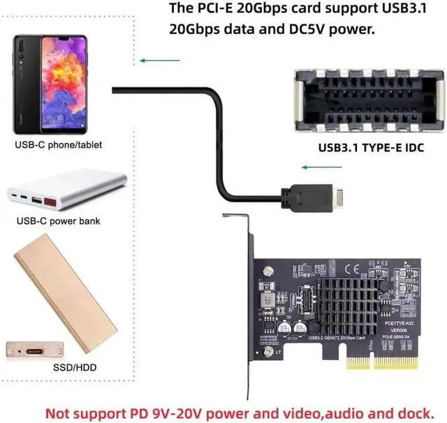 USB 3.2 Gen2 Type-E 20Gbps Front Panel Socket to PCI-E 4X Express Card Adapter for Desktop Motherboard