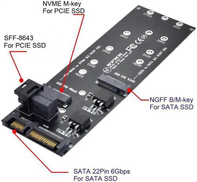 1. One M.2 PCIe SSD in 22110, 2280, 2260, 2242 and 2230 format can be connected and used as a replacement for a 2.5 HDD. The converter can be installed into the system internally through the SFF-8643 HD Mini interface.