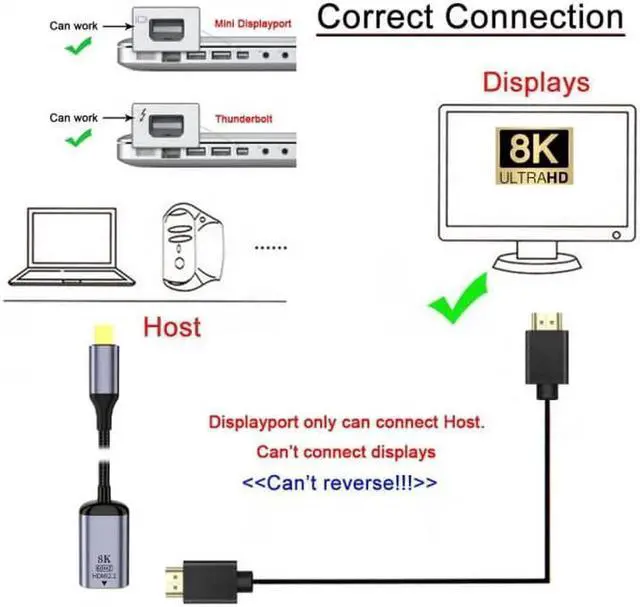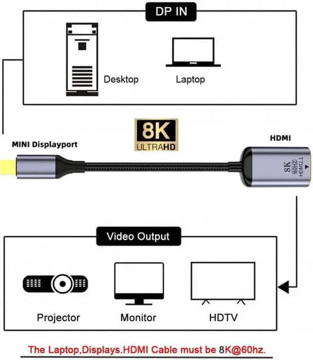 MINI DP x HDMI cable supports 8K@60Hz, 4K@60Hz for MINI DisplayPort Enabled Desktops and Laptops to Connect to HDMI Displays, enjoy home theater with 8K/4K high resolution.