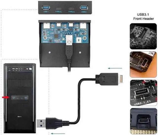 USB 3.1 Front Panel Header to USB-C USB 3.0 HUB 4 Ports Front Panel Motherboard Cable for 3.5" Floppy Bay