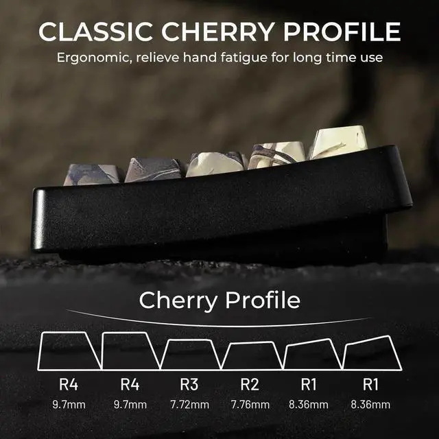 Cherry Profile Keycap SetThe keyboard keycaps designed with the classic cherry profile, it is ergonomic,you won't get tired even if you use it for a long time.