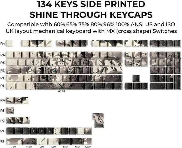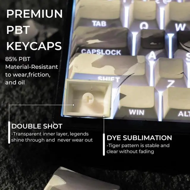 5-Sided Dye Sublimation KeycapsAdvanced dye-sublimation technology allows the color to penetrate into the keycaps, making the tiger pattern on the keycaps very clear and wont fade for long time using.