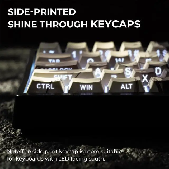 Double Shot Shine Through KeycapsTo ensure the integrity and legends visibility of your keyboard, we use side-printed shine through legends. The double shot technology that is two layerstransparent inner layer and pbt outer layerare molded into one, so the keycaps legends will never falls off and light tramsmission.