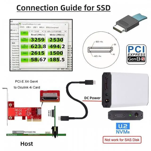1. Oculink SFF-8612 SFF-8611 to M.2 NGFF M-Key to NVME PCIe SSD 2280 SSD Enclosure Adapter for Mainboard