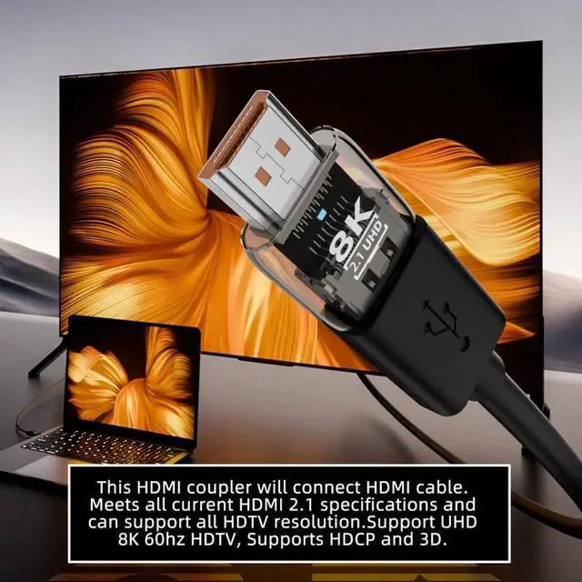 This HDMI coupler will connect HDMI cable. Meets all current HDMI 2.1 specifications and can support all HDTV resolution. Support UHD 8K 60hz HDTV, Supports HDCP and 3D., An HDMI coupler for joining extension cable together.