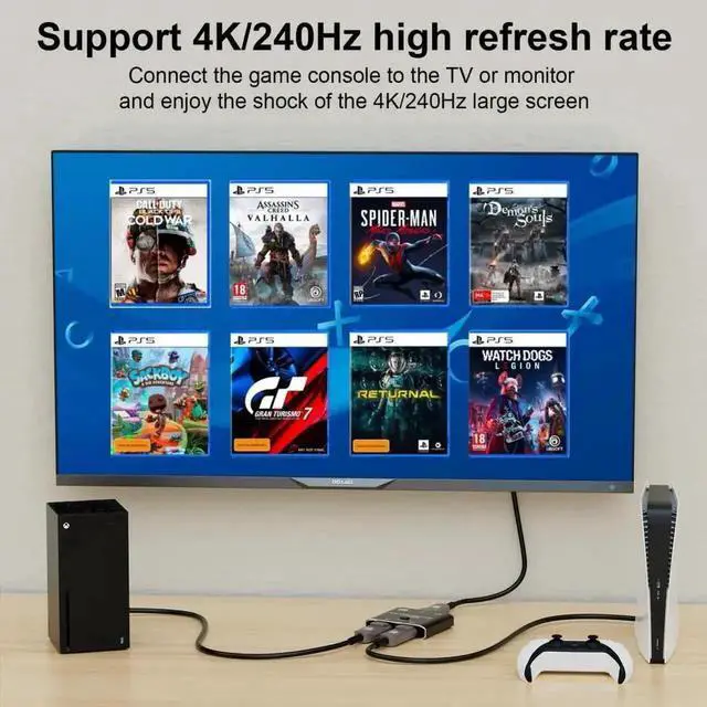 DP 2.0S witch: Support16K@60Hz, 8K@60Hz, 4K@240Hz, 4K@144Hz, 1080P@240Hz resolution, provide you with transfer rates up to 80Gbps and backward compatible with all previous DP standards. (You need connect standard DP 2.0 cable to enjoy visual effects. )Plug and