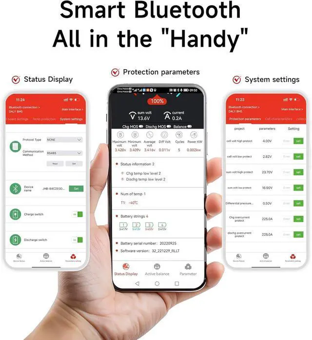 Múltiples funciones de interfaz: admite comunicación UART dual, módulo BT y pantalla táctil. Cuenta con función sin activación Bluetooth: simplemente abre la aplicación para activar el BMS para una fácil conexión.