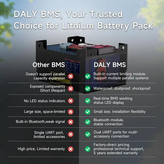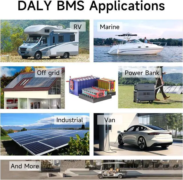 Soporta múltiples sistemas paralelos: el circuito paralelo integrado de DALY BMS admite más de 8 paquetes de baterías, lo que te permite ampliar la capacidad simplemente agregando más baterías, más potencia, mayor tiempo de funcionamiento.