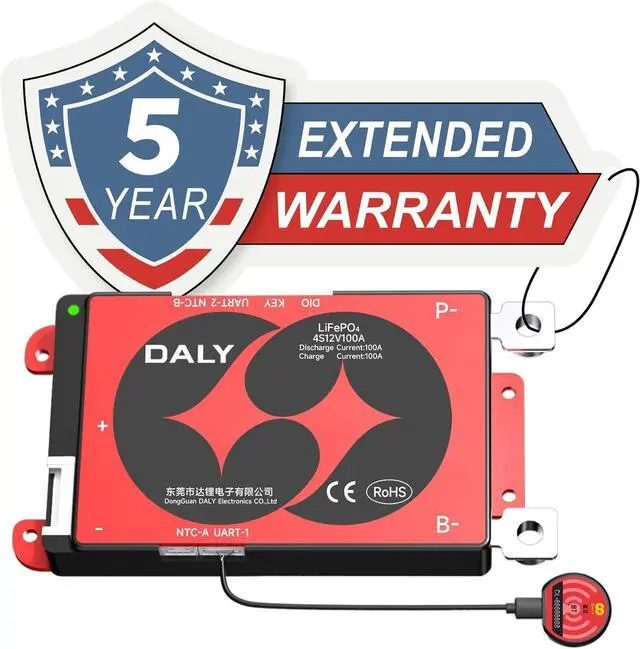 5 años de garantía. Lista de embalaje: 4S 12V 100 Amps Smart BMS ×1, línea de salida B-P ×1, dongle BT ×1, cable de muestreo ×1, NTC ×1, manual ×1. Fácil de instalar: todo lo que necesitas para la configuración y operación. Certificaciones: ISO/FCC/RoHS/PSE/CE aprobado.