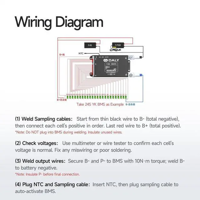 Amplia aplicación: admite paquetes 4S 6S 7S 8S a 12V 24V para Li-ion, LiFePO4 y LTO. Cubre varios tipos de baterías con un solo BMS, no requiere placas adicionales.