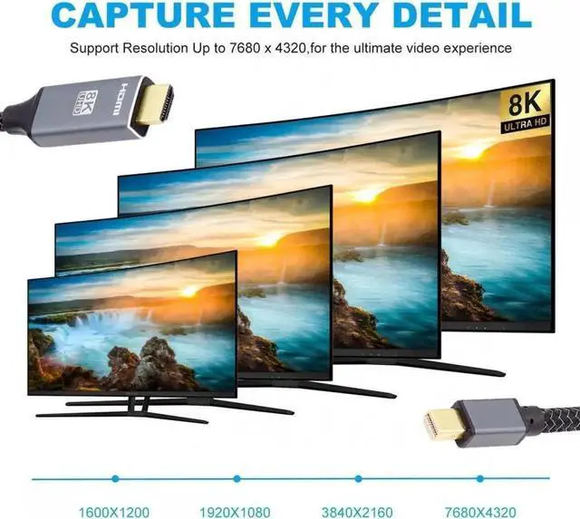MINI DP x HDMI cable supports 8K@60Hz, 4K@60Hz for MINI DisplayPort Enabled Desktops and Laptops to Connect to HDMI Displays, enjoy home theater with 8K/4K high resolution.