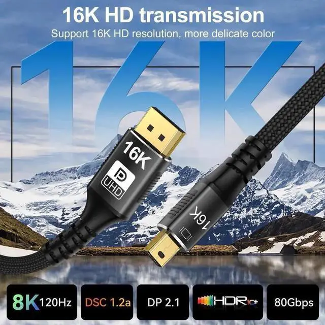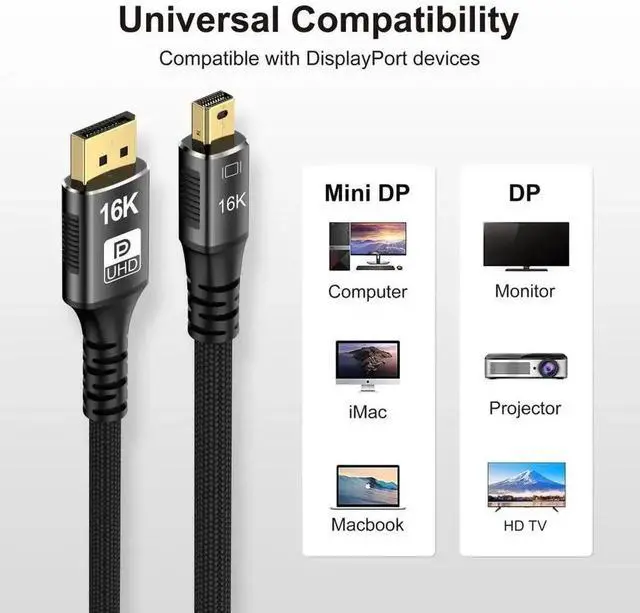 2) 16K@60Hz Video: 16K MiniDisplay Port cable 2.1 supports 16K@60Hz with DSC, 10K@60Hz, 8K@120/60Hz, 4K@240/165/144Hz, 2K@240/165/120Hz , ensuring high quality content transmission and lossless audio output.