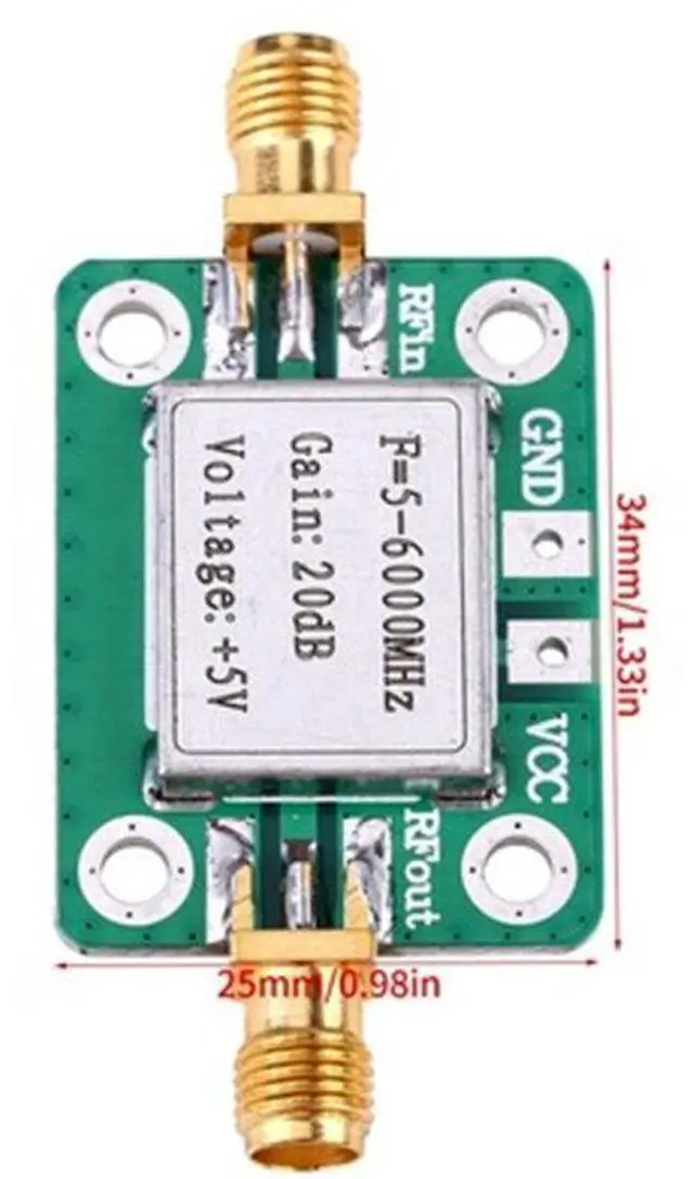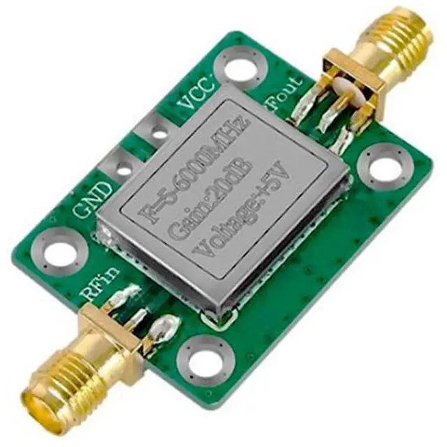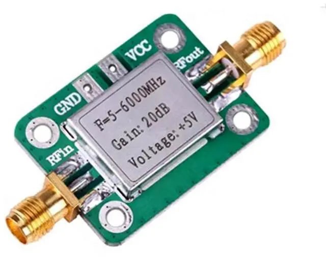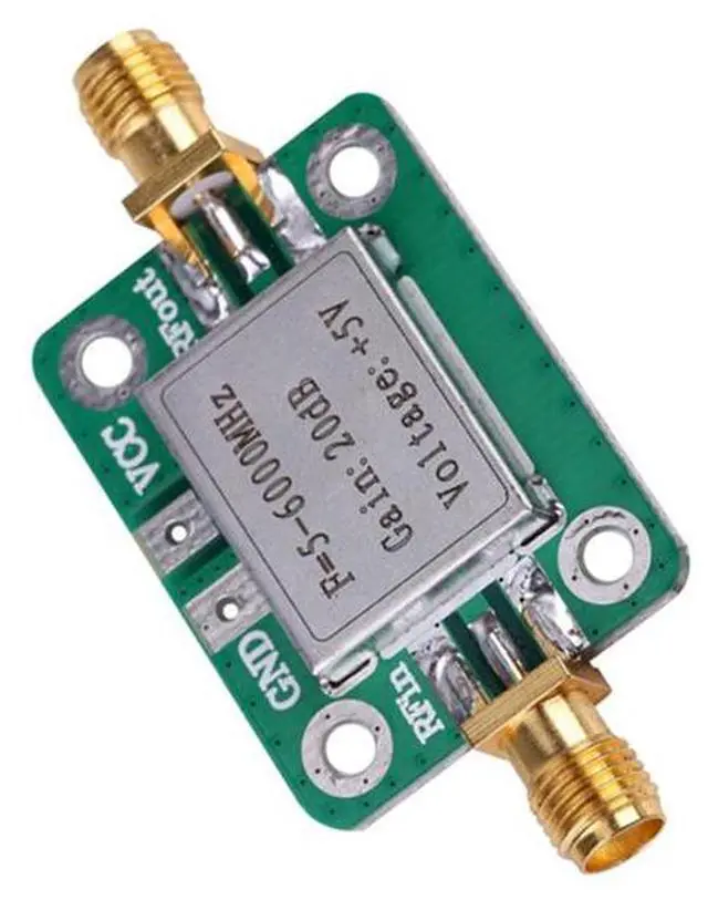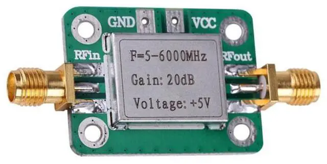 RF ultra-wideband power amplifier with a gain of 20 dB from 5 MHz to 6 GHz. Operating frequency range of 5 - 6000 MHz. Equipped with a shielding shell.