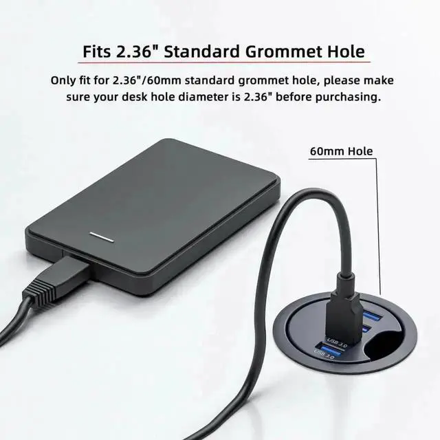 4. 3) Fits 2.36" Standard Grommet Hole: Only fit for 2.36"/60mm standard grommet hole, please make sure your desk hole diameter is 2.36" before purchasing.