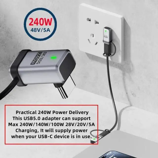 ThisUSB5.0 adapter can support Max240W/140W/100W 28V/20V/5A Charging, It will supply power when your USB-C device is in use. Reversible Design for Type C connector,Reversible plug orientation Cable direction.
