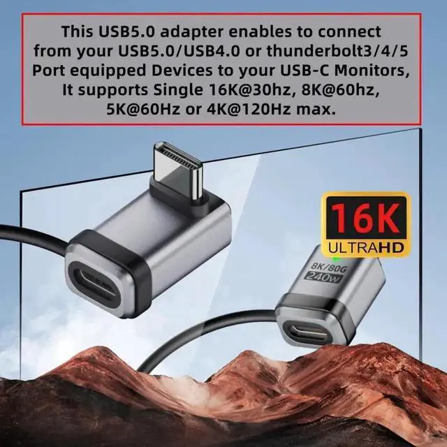 This USB5.0 adapter enables to connect from your USB5.0/USB4.0 or thunderbolt3/4/5 Port equipped Devices to your USB-C Monitors, It supports Single 16K@30hz, 8K@60hz, 5K@60Hz or 4K@120Hz max. video Resolution in your external displays.(please make sure your monitor's Type-c port support DP Alternate Mode for Video.)