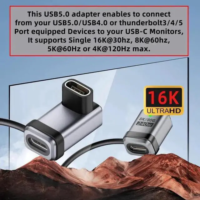 This USB5.0 adapter enables to connect from your USB5.0/USB4.0 or thunderbolt3/4/5 Port equipped Devices to your USB-C Monitors, It supports Single 16K@30hz, 8K@60hz, 5K@60Hz or 4K@120Hz max. video Resolution in your external displays.(please make sure your monitor's Type-c port support DP Alternate Mode for Video.)