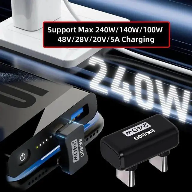 ThisUSB5.0 adapter can support Max240W/140W/100W 28V/20V/5A Charging, It will supply power when your USB-C device is in use. Reversible Design for Type C connector,Reversible plug orientation Cable direction.