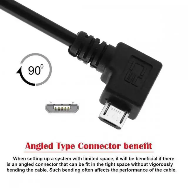 Micro USB is angled connector, This Angled type Cable Allowing you to connect the cable to a female port, even if space around the port is limited.No more need to twist your cables, so now you have a straight connection to your cable and better quality signal to your device.