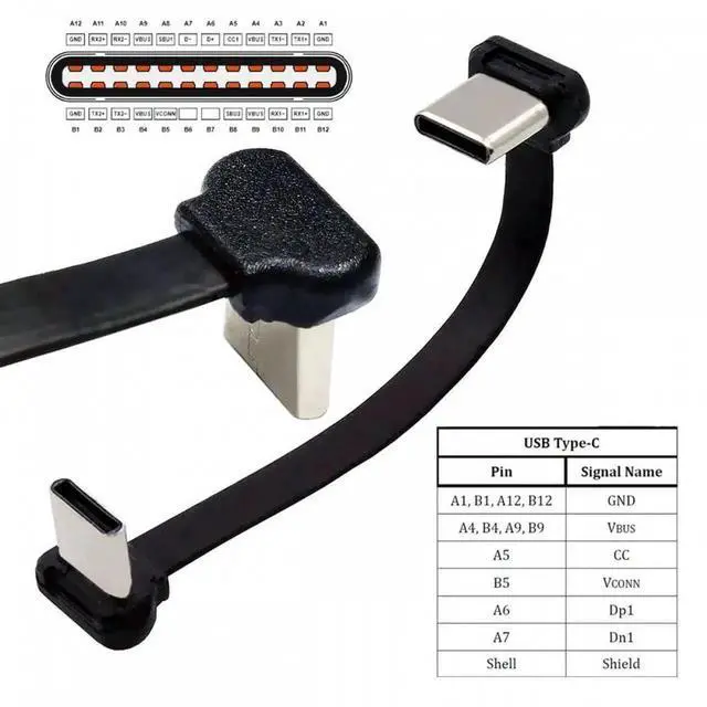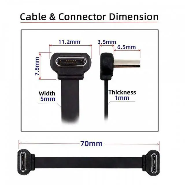 USB-C Type C to USB-C Ultra Slim Flat Power USB2.0 Data Cable Angled Connector 65W Fast Charge