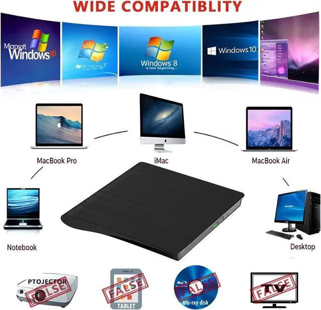 Wide Compatibility: This external CD DVD drive is compatible with Windows11/10/ 8.1 /7/Vista/XP/98/SE/ME/2000, Linux, and Mac OS. It is perfect for laptops, PCs, desktops, Macs, iMacs, MacBook Air/Pro, and all-in-one computers. However, this DVD drive USB external is not compatible with Chromebook, TV, Car, Blu-ray, PSC, Tablet, iPad, etc