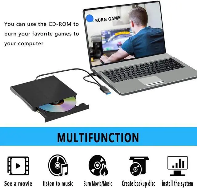 Widely Used USB DVD Drive External: Tired of not being able to watch movies, listen to music, or backup your data because your laptop lacks a DVD drive This DVD burner lets you do all that and more. This CD burner for laptop is perfect for burning software/files, watching movies, installing software/games, backing up data to discs, and listening to music etc