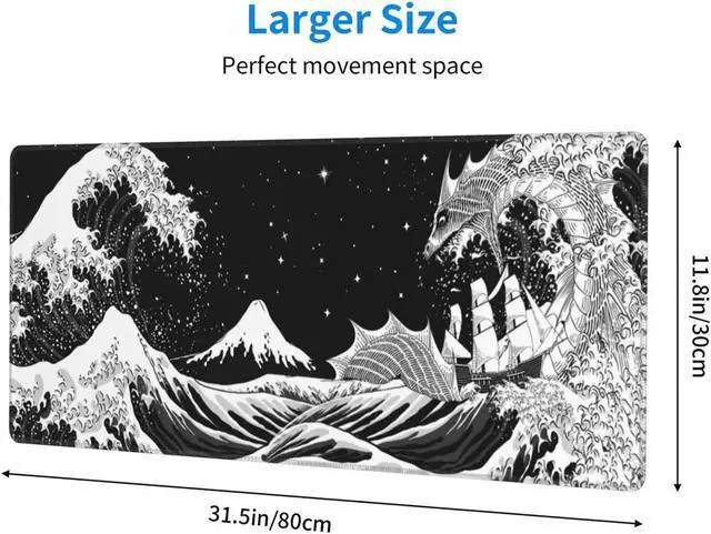 Black and White Japanese Waves Sea Dragon Gaming Mouse Pad XL, Extended Large Mouse Mat Desk Pad, Stitched Edges Mousepad, Long Non-Slip Rubber Base Mice Pad, 31.5 X 11.8 Inch