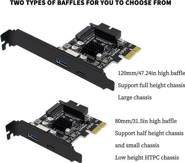 PH63C PCIe X1 to USB 3.0 A, USB-C, Type-E, 19/20-Pin Expansion Card with SATA 15-Pin Power and Aluminum Heatsink Compatible with Desktop PC Windows/Linux/MacOS (Full-Height Baffle)