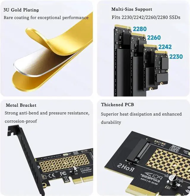 Supports Multiple Sizes \u2013 Compatible with 2230, 2242, 2260, and 2280 NVMe SSDs, offering flexible installation.