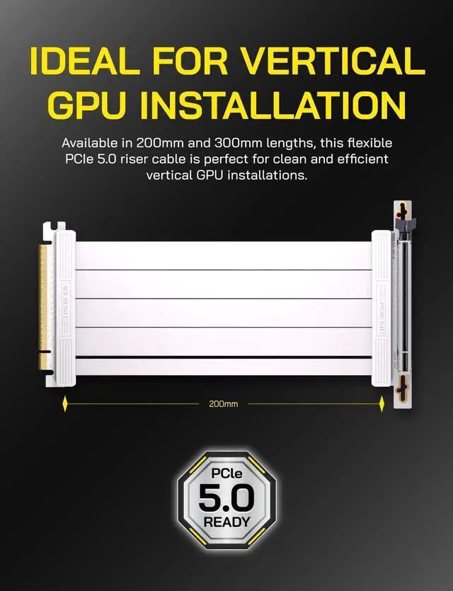 [ CHOOSE YOUR PERFECT FIT] Available in 200mm and 300mm lengths with 90° and 180° connector options, this flexible PCIe 5.0 riser cable is ideal for clean, efficient vertical GPU setups.