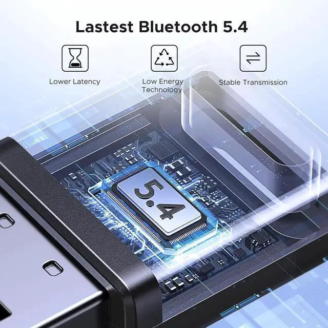 Bluetooth 5.4 Technology: This USB Bluetooth adapter features Bluetooth 5.4 technology, delivering faster data transfer speeds and a more stable connection compared to Bluetooth 5.3.