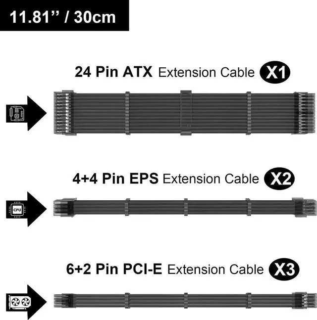 Cable Extension Includes1×24-pin ATX, 2×4+4pin EPS, 3X6+2Pin PCI-E, suitable for high power GPU and graphics card power supplies.
