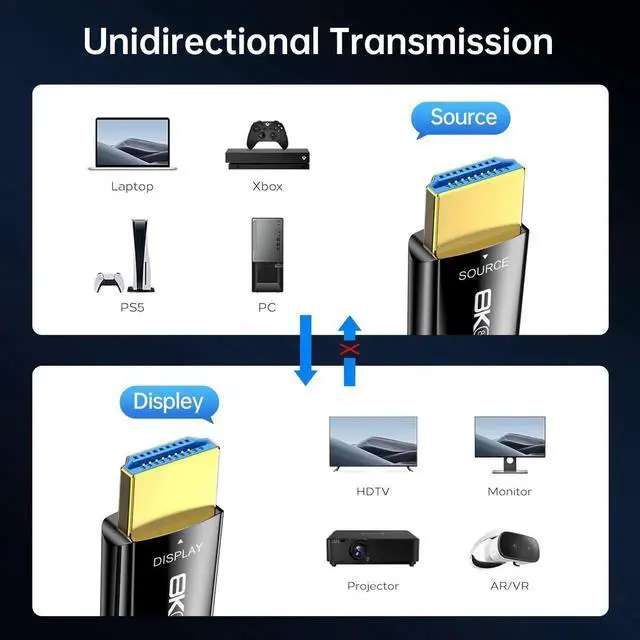 8K Fiber Optic HDMI cable: Higher video resolutions support higher resolutions and faster refresh rates including 8K@60Hz, 4K@240Hz/120Hz. Wide Compatibility: 8K HDMI cable with last version 2.1, backward compatible with version 2.0 / 1.4 / 1.2 / 1.1 .Support for Laptop, HDTV, Blu-Ray Player, Monitor, Projector, etc. Thin HDMI 2.1 cable: fiber optic HDMI cable, have greater bandwidth and faster speed, less signal attenuation, longer life than traditional copper cores, and thinner and lighter. Strong Performance : Support for 3D video,8K 7680*4320 resolution, 8K@60Hz, 4K@240Hz/120Hz,HDR, dynamic HDR, VRR, QMS, enhanced audio return channel eARC. The optical fiber hdmi cable is uni-directional transmission, The plugs at each end are marked "SOURCE/DISPLAY", please note that source is the signal source (such as laptop, PC and Blu-ray player etc) and display is the display end (such as monitor, TV, projector etc).