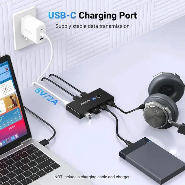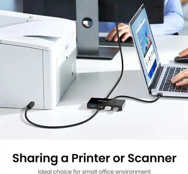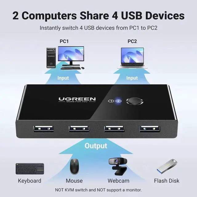 2 in 4 Out USB Switch Box: UGREEN 4 port USB sharing switch allows one button swapping between 2 computers to share 4 USB 2.0 peripheral devices without constantly swapping cables or setting up complicated network sharing software. (*Not a KVM switch and does not support a monitor or video transmission.*)