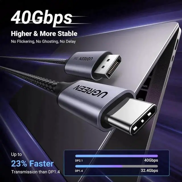 Dive into Future with 16K USB C to DP Cable: The UGREEN USB C to Displayport 2.1 cable supports 16K@30Hz resolution (backward supports 8K@120Hz, 4K@240Hz, 2K@480Hz) , promising an unprecedented level of detail and realism to help you explore the future of visual display technology. It connects a phone or laptop with a USB Type-C or Thunderbolt 4/3 port to a monitor with DisplayPort for bigger visual experience and there is no need for a driver, or software