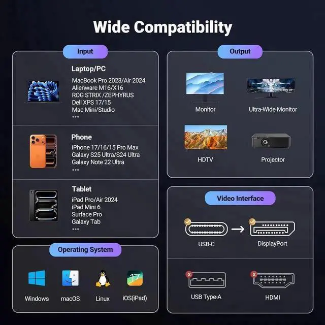 Compatible Devices iPhone 17 Pro Max/17 Pro/Air/17/16 Pro Max/16 Pro/16 Plus/16, Mac Mini M4/M4 Pro, MacBook Pro M4/M4 Pro/M4 Max,, MacBook Air 2024, Galaxy S25/24 Ultra, iPad Pro 2024, iPad Air 2024, XPS 17/15/13, Dell, HP Chromebook x360, Surface Book 3/2, Samsung Tablet S9, Note 20, LG V40, Valve Steam Deck, Odyssey G8 G9, Nvidia RTX 5090 and AMD Radeon RX 7900 graphics cards, HDTViPhone 17 Pro Max/17 Pro/Air/17/16 Pro Max/16 Pro/16 Plus/16, Mac Mini M4/M4 Pro, MacBook Pro M4/M4 Pro/M4 Max,, MacBook Air 2024, Galaxy S25/24 Ultra, iPad Pro 2024, iPad Air 2024, XPS 17/15/13, Dell, HP Chromebo See more