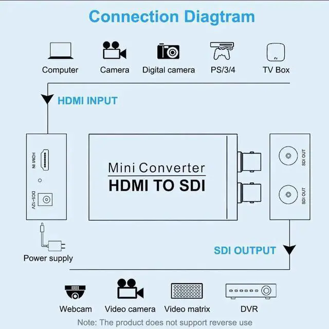 HDMI Video Input: HDMI Type A in, Convert high definition HDMI signal to SDI signals. NOTE: This is not a bi-directional converter. Can NOT be used for SDI to HDMI conversion