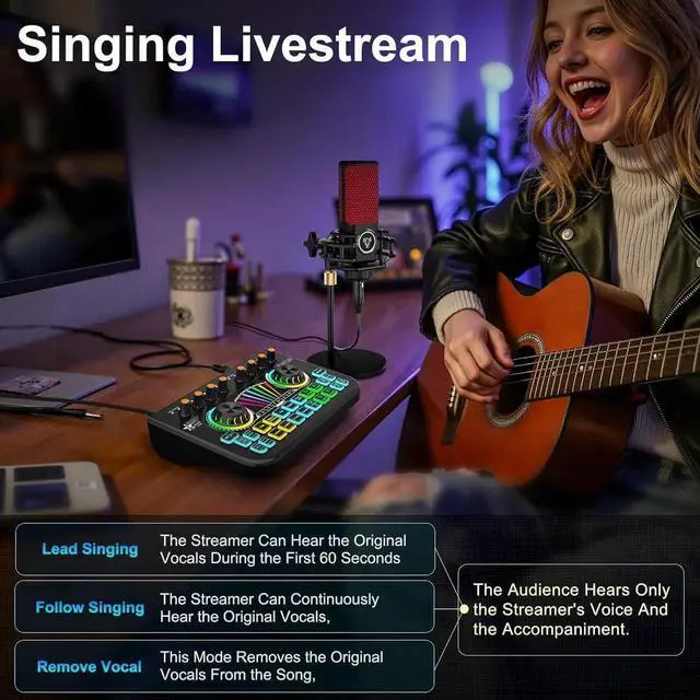 - Voice Changer Knob for Versatility:Transform your voice effortlessly with the built-in voice changer knob, offering options like female, male, baby, or robot voices. Additionally, you can use 4 reverb modes, 12-step auto-tune, Bluetooth accompaniment, and lead singer mode to create a captivating atmosphere for your streams, podcasts, or videos, adding an extra layer of entertainment.