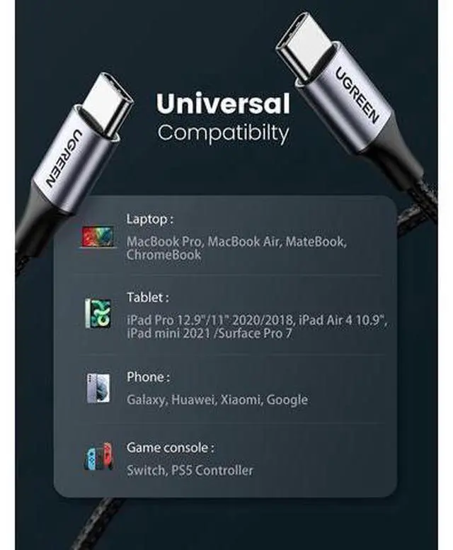 Broad Compatibility: Unlike the market`s most USB C cable incapable of charging high power devices, UGREEN type c to type c cable can work seamlessly with Laptops(MacBook Pro 2021, etc), Cellphones(Samsung S21, Google Pixel, LG, etc. ), Tablets(iPad Pro, etc. ), Switch and more. Suitable for any phone case