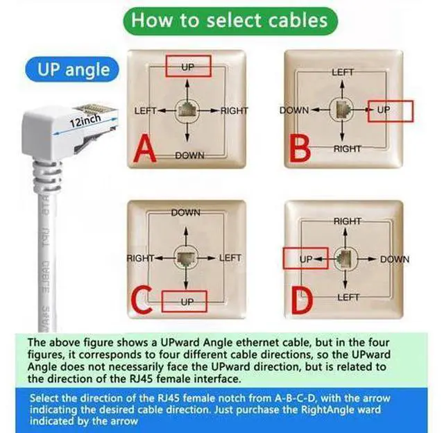 Universal Compatibility Right angle adapter overall length: 1.2 in, Ideal for LAN network devices such as PCs, computer servers, printers, routers, switch boxes, network media players, NAS, VoIP phones, PoE devices, and more. Please refer to the picture to select Correct ethernet 90 degree cable Perfect for the clean look, No more bend in the wire and allows the furniture right against the wall. If you buy in the wrong direction, you can try inverting the RJ45 LAN wall socket.