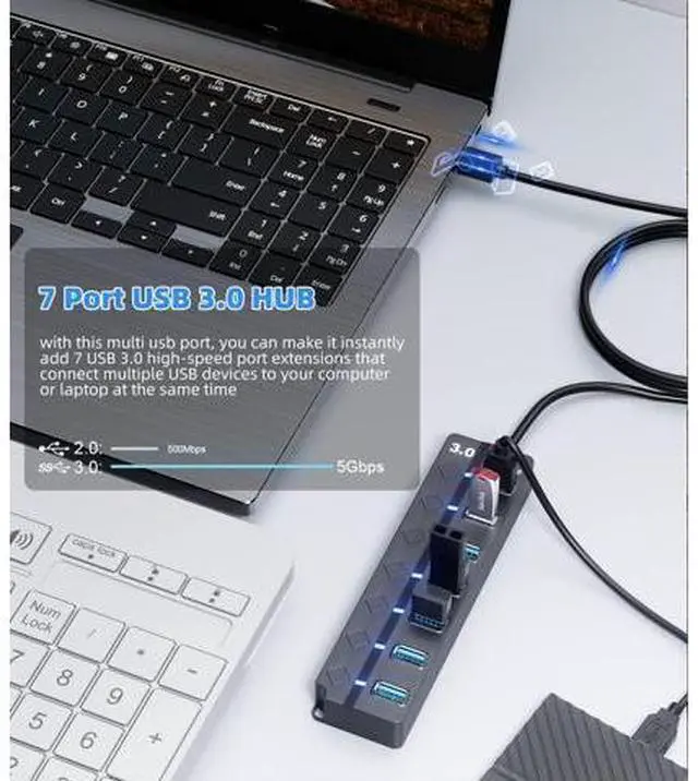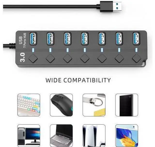 • USB 3.0 Hub PANPEO 7-Port USB Data Hub Splitter with 3ft Long Cable USB Extension for Laptop PC Computer Surface Pro PS4/5 Flash Drive Mobile HDD - with LED Individual On/Off