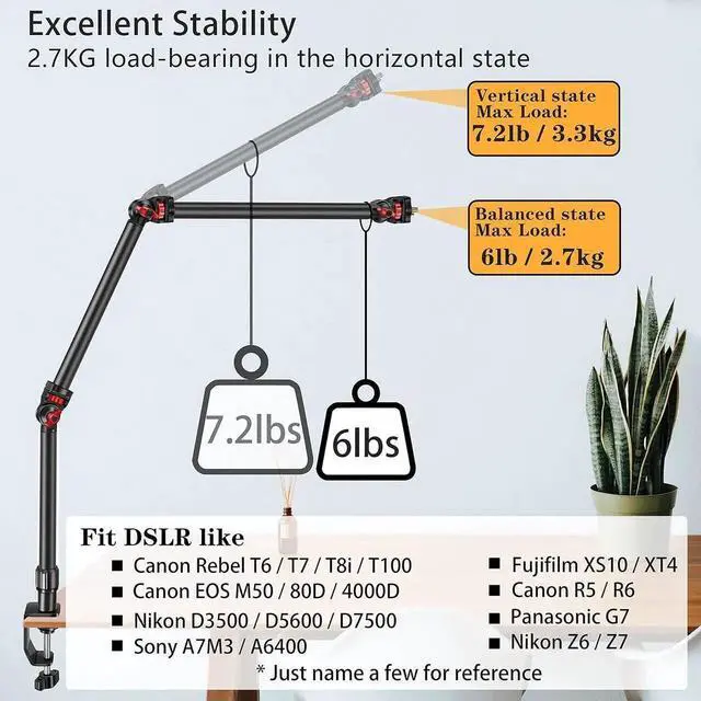 The aluminum tabletop light mount desk clamp with padded to protect your device or table from scratches. Dimensions can be extended up to 2.4 in/6cm in height, Compatible with most desks. With locking adjustment knob, Bring a more stable & safer live broadcast experience. A necessory camera gear content creator kit for YouTubers.
