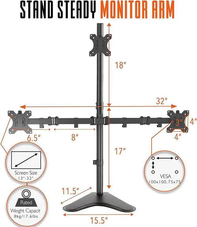 - FITS MOST MONITORS: The Stand Steady Monitor Mount supports three screens at once! This triple monitor stand fits screens ranging from 13 to 32 inches, up to 17.6 lbs. each, while the durable metal base ensures your monitors stay securely in place